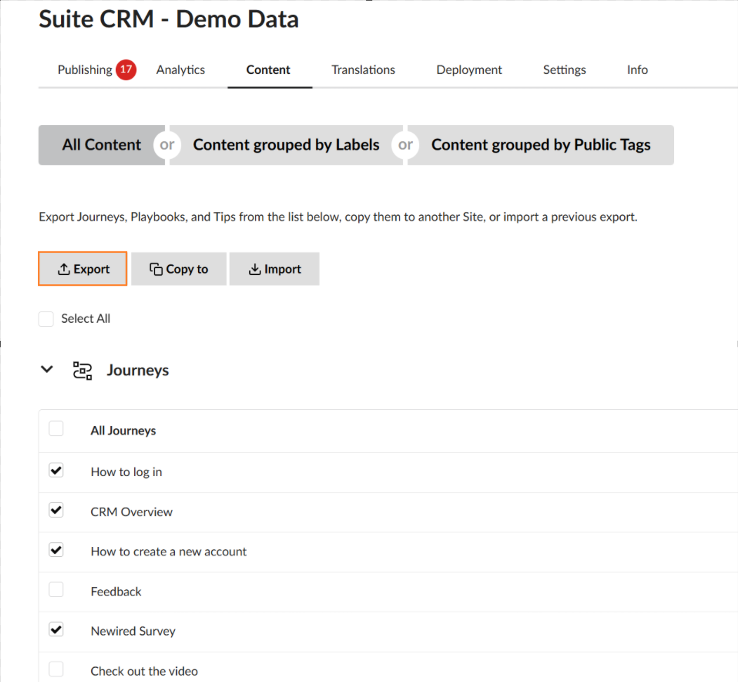 You can also select the content for export using filtering in the "Content grouped by Labels" or "Content grouped by Public Tags" sections.
